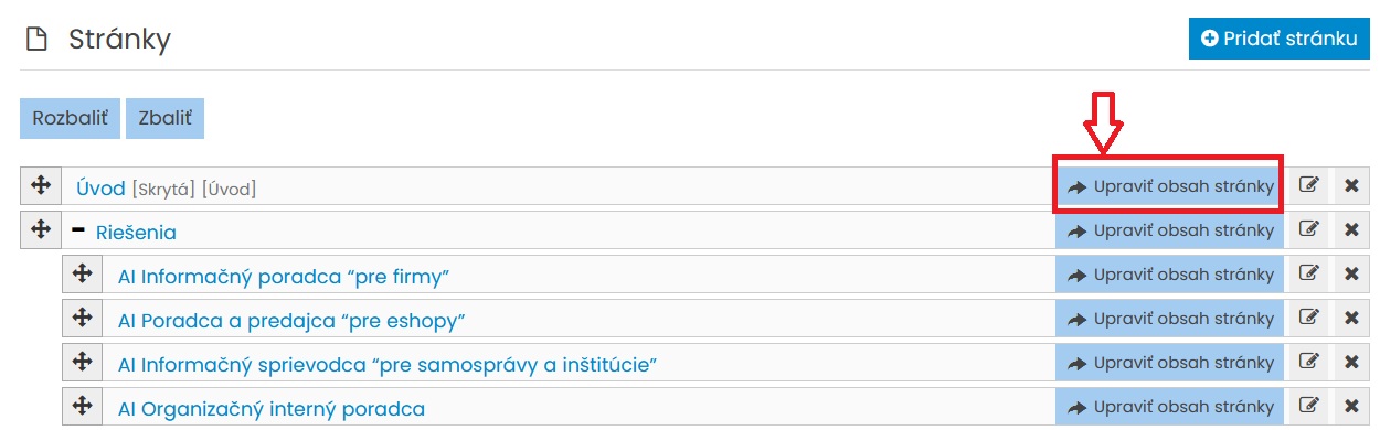 - Na stránku s už existujúcim obsahom - tam, kde chcete vložiť modul - kliknite na Upraviť obsah stránky