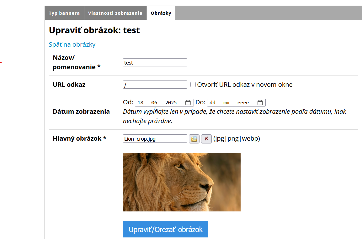V prípade ak obrázok nevyhovuje danému rozmeru môžete ho orezať na rozmer banera, ktorý ste zadali v bode 3.