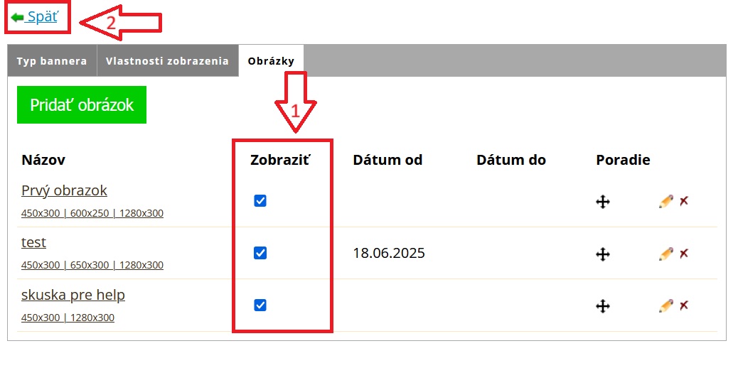 9. Takýmto spôsobom môžete nahrať ľubovoľné množstvo obrázkov. Pre aktívne zobrazovanie sa obrázkov v baneri je potrebné zaškrtnúť požadované obrázky. Následne kliknite na ikonu “Späť“.