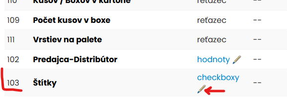 2. Potom v eshope prejdite do časti v Admine Produkty - Parametre a v parametri číslo 103 s názvom "Štítky" kliknite na políčko "checkboxy".