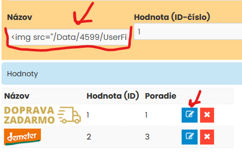 3. V už existujúcom parametri si kliknú na ceruzku a skopíruju si text z políčka Názov v nasledovnom formáte: <img src="/Data/4599/UserFiles/images/stitky/demeter.webp"> a kliknú na tlačítko Uložiť