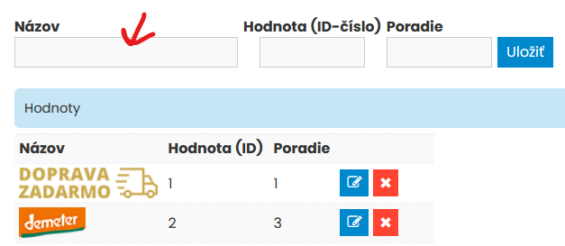 4. Hore nad existujúcimi parametrami sú prázdne políčka pre založenie novej hodnoty parametrov. Do políčka názov si vložia text skopírovaný z predchádzajúceho kroku s tým, že si tam upravia v URL k obrázku názvo nového štítku ktorý sa má použiť. Takže napríklad z pôvodného textu: <img src="/Data/4599/UserFiles/images/stitky/demeter.webp"> sa upravý názov obrázku a nový text do políčka názvo bude vyzerať nasledovne: <img src="/Data/4599/UserFiles/images/stitky/