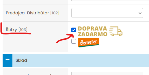6. Zobrazenie štítku nastavujete v Admine pri konkrétnom produkte - zakliknite si v parametroch produktu že sa má štíktok zobraziť podľa obrázku ktorý na produkte chcete mať.