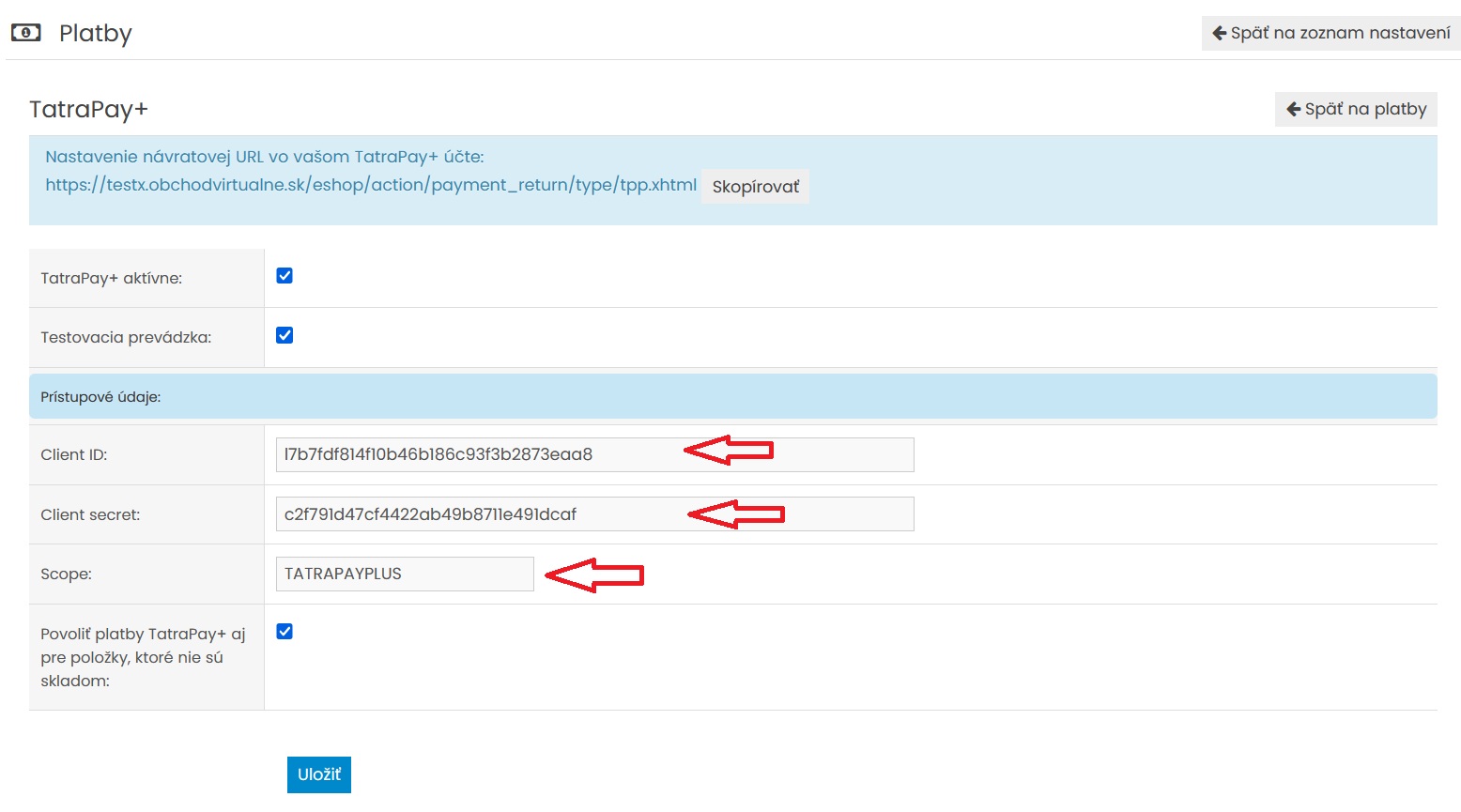 V rozhraní TatraPay+ nájdete údaje pre vyplnenie kolóniek Client ID a Client Secret