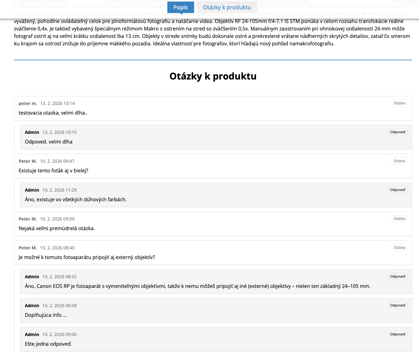 - zobrazovanie otázok a odpovedí administrátora časté otázky k produktu